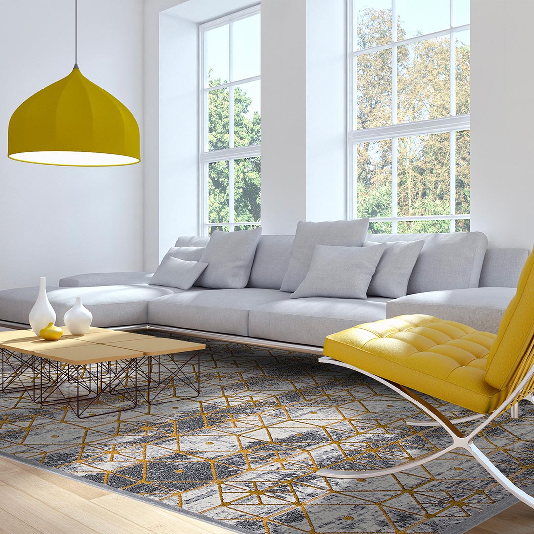 Voilà un de nos préférés de la gamme GABRIELLE : un tapis graphique et contemporain et de belles tonalités de gris et d'or.