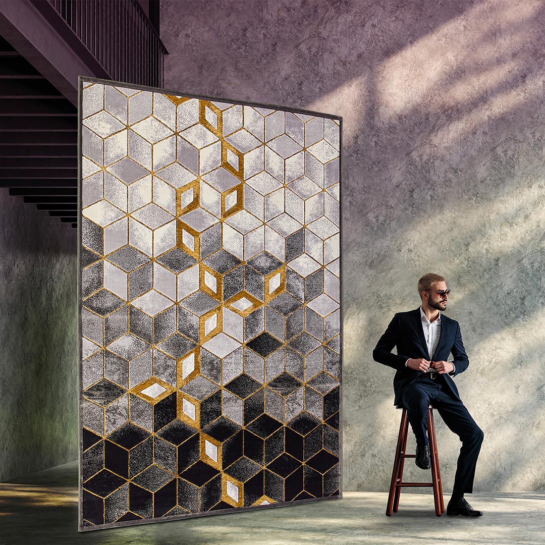 Voilà un de nos préférés de la gamme GABRIELLE : un tapis graphique et contemporain, un effet 3D et de belles tonalités de gris et d'or.